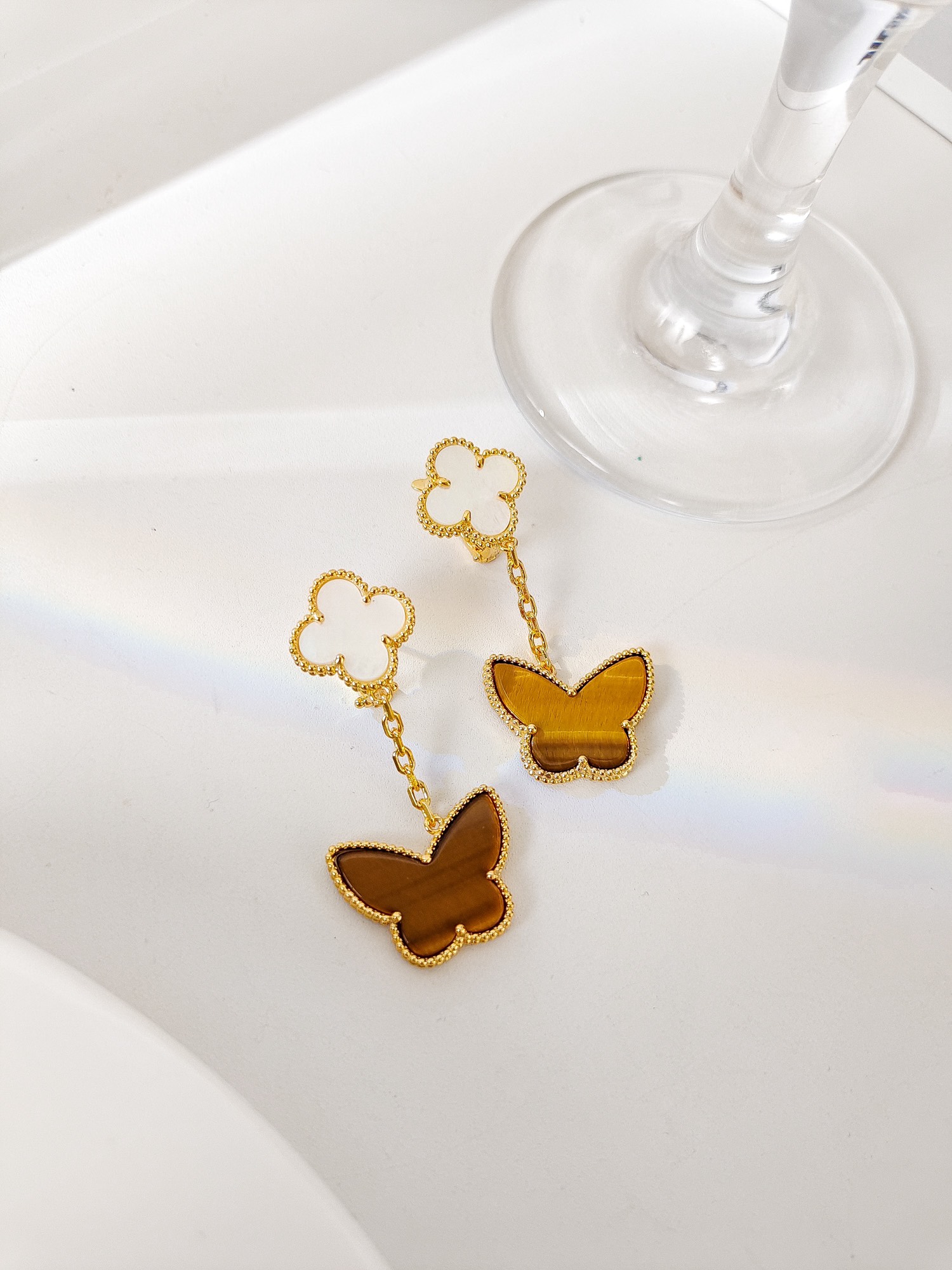 ホワイトシェル+タイガーアイ バタフライダブルフラワーピアス|Luckyスタイル