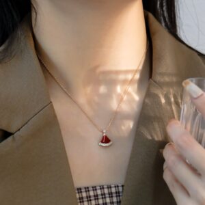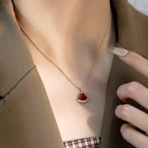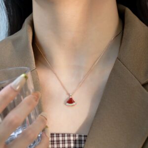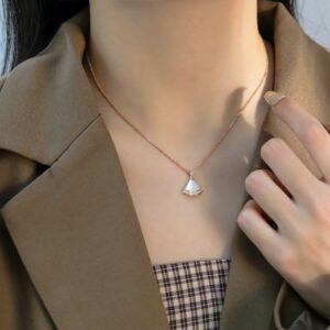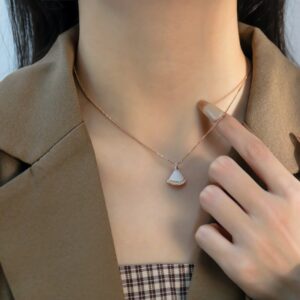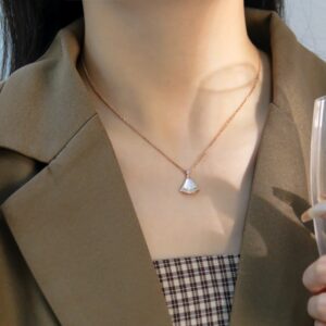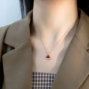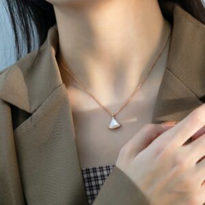 古代ローマのモザイク模様に着想を得た扇形のフォルムが、女性らしい優雅な雰囲気を演出します。ペンダント部分には、光沢のあるホワイトシェルまたは深みのあるレッドカーネリアンを使用し、上品で洗練された印象に。日常使いはもちろん、フォーマルなシーンでも活躍するタイムレスなデザインです。