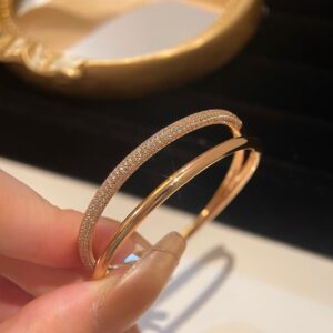 結び目をモチーフにしたミニマルなデザインに、片側のみダイヤモンドをあしらった繊細なバランスが魅力のバングル。「結ぶ」「つなぐ」という意味を持つノットが、絆や想いをさりげなく表現。ローズゴールドの柔らかな輝きが手元に上品さを添え、単体でもレイヤードでも美しく決まります。自分へのご褒美にも、大切な方への贈り物にもふさわしい、洗練された一本です。