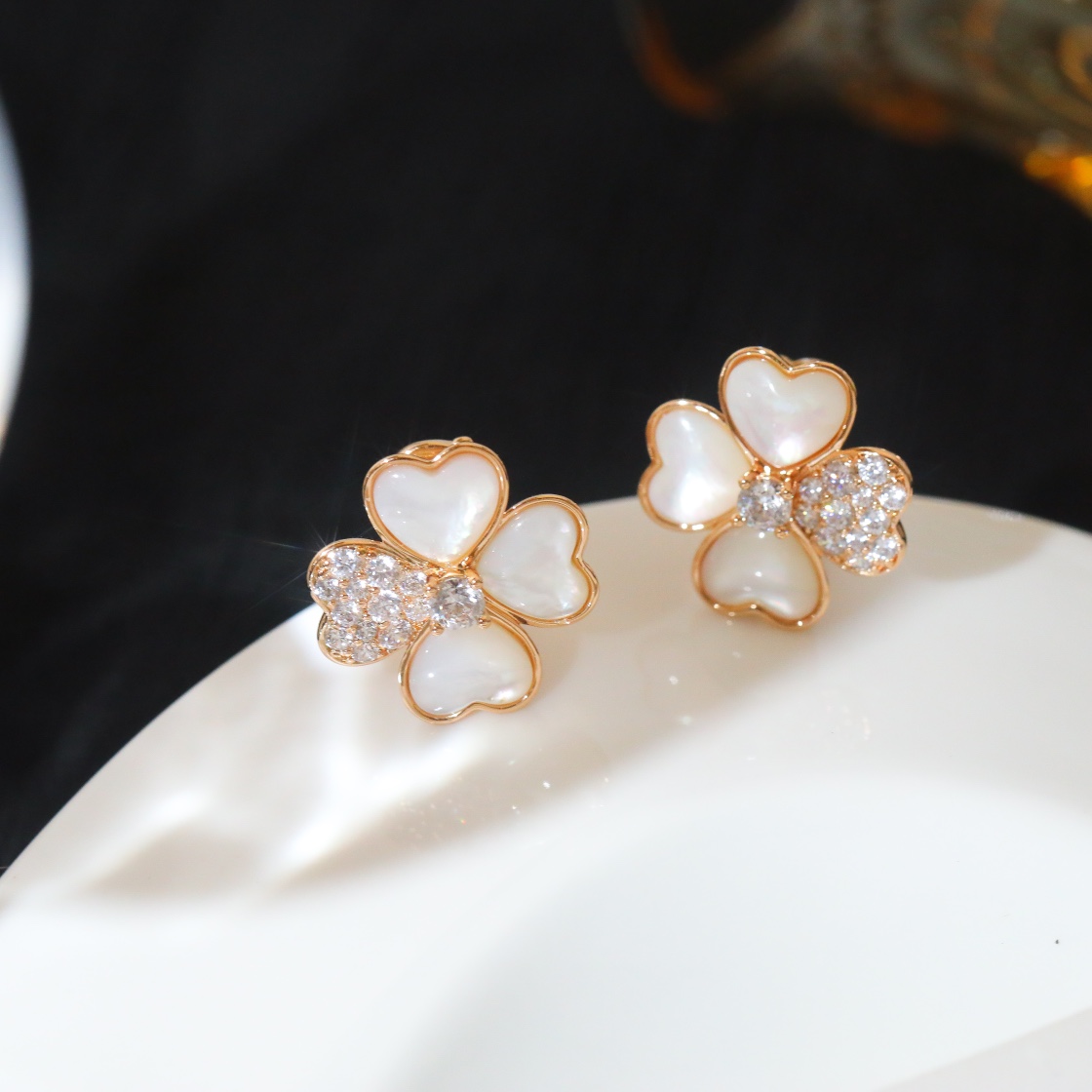 ホワイトマザーオブパール×ダイヤモンド 四つ葉モチーフピアス|ローズゴールド/イエローゴールド|Van Cleef & Arpelsスタイル