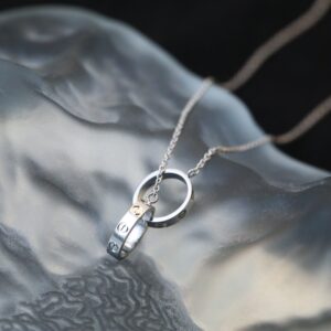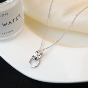 CartierスタイルのLOVEシリーズのミニネックレス。2つのリングが重なり合うシンプルでエレガントなデザイン。ダイヤモンドなしのホワイトゴールドとピンクゴールドの2色展開で、控えめながらも存在感があり、どんなスタイルにも自然に調和します。